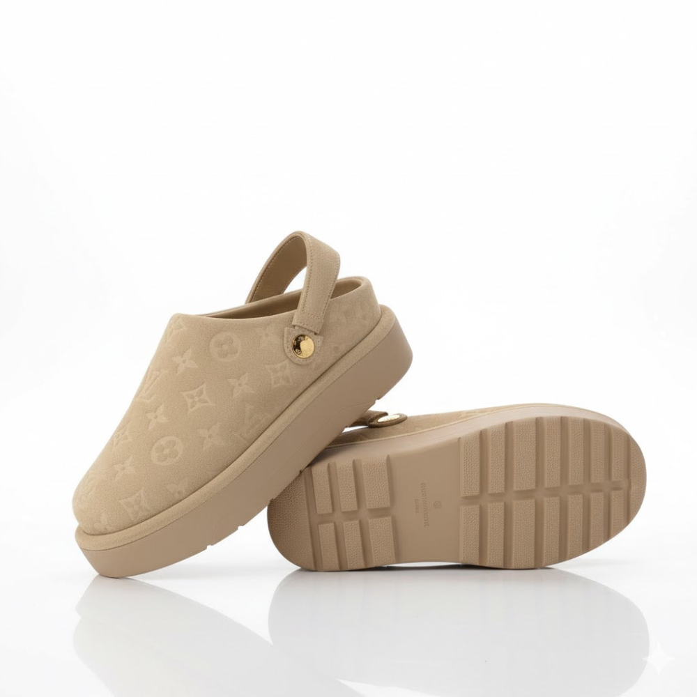 Model: Aspen Platform Clog – crafted from smooth calf leather with an ultra-soft shearling lining, this Louis Vuitton clog combines alpine-inspired luxury with everyday ease. The bold rubber platform sole adds height and durability, while the gold-tone LV Initials buckle lends a signature finish. Designed for slip-on comfort with a contoured footbed that supports every step, it’s perfect for cozy winter styling or refined casual wear. Care & Material: Calf leather, shearling lining, rubber outsole. Colour: Cognac / Natural.